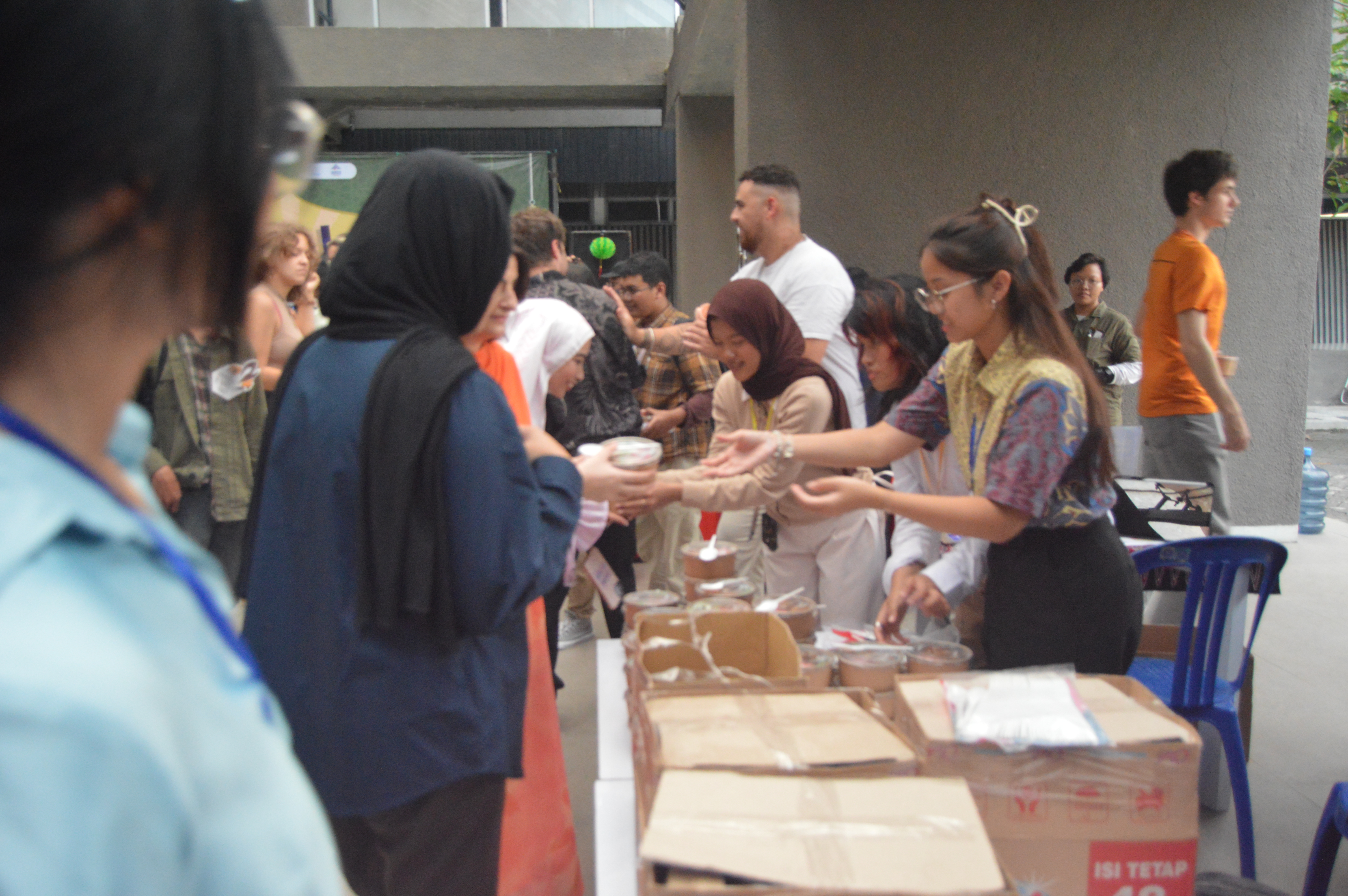 Pembagian takjil kepada peserta pameran budaya internasional ketika menjelang berbuka