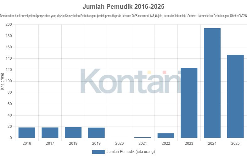 Dikutip dari katadata.co.id, Menteri Perhubungan Republik Indonesia Dudy Purwagandhi memproyeksikan sebanyak 146,48 juta jiwa akan melakukan pergerakan selama libur Lebaran 2025. Angka ini menunjukan penurunan sebesar 24,33% dibandingkan tahun lalu sebanyak 193,6 juta orang. Sebanyak 81,5 juta orang dari keseluruhan total akan bergerak dari Pulau Jawa.