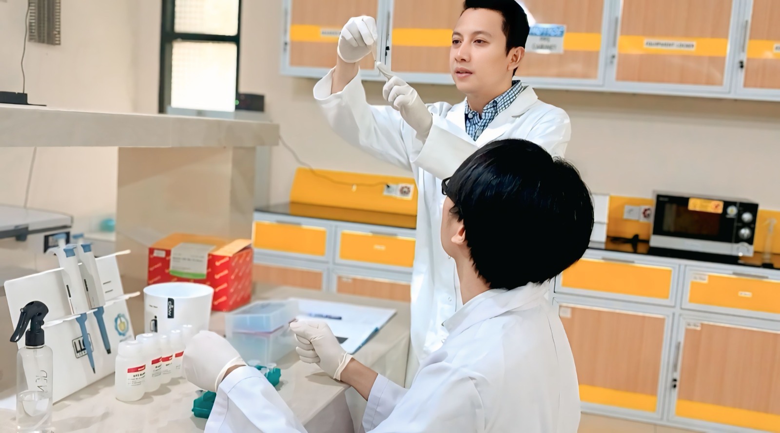 Prof Dr Nurul Jadid SSi MSc (berdiri) saat mengerjakan penelitian bersama dengan mahasiswa bimbingannya