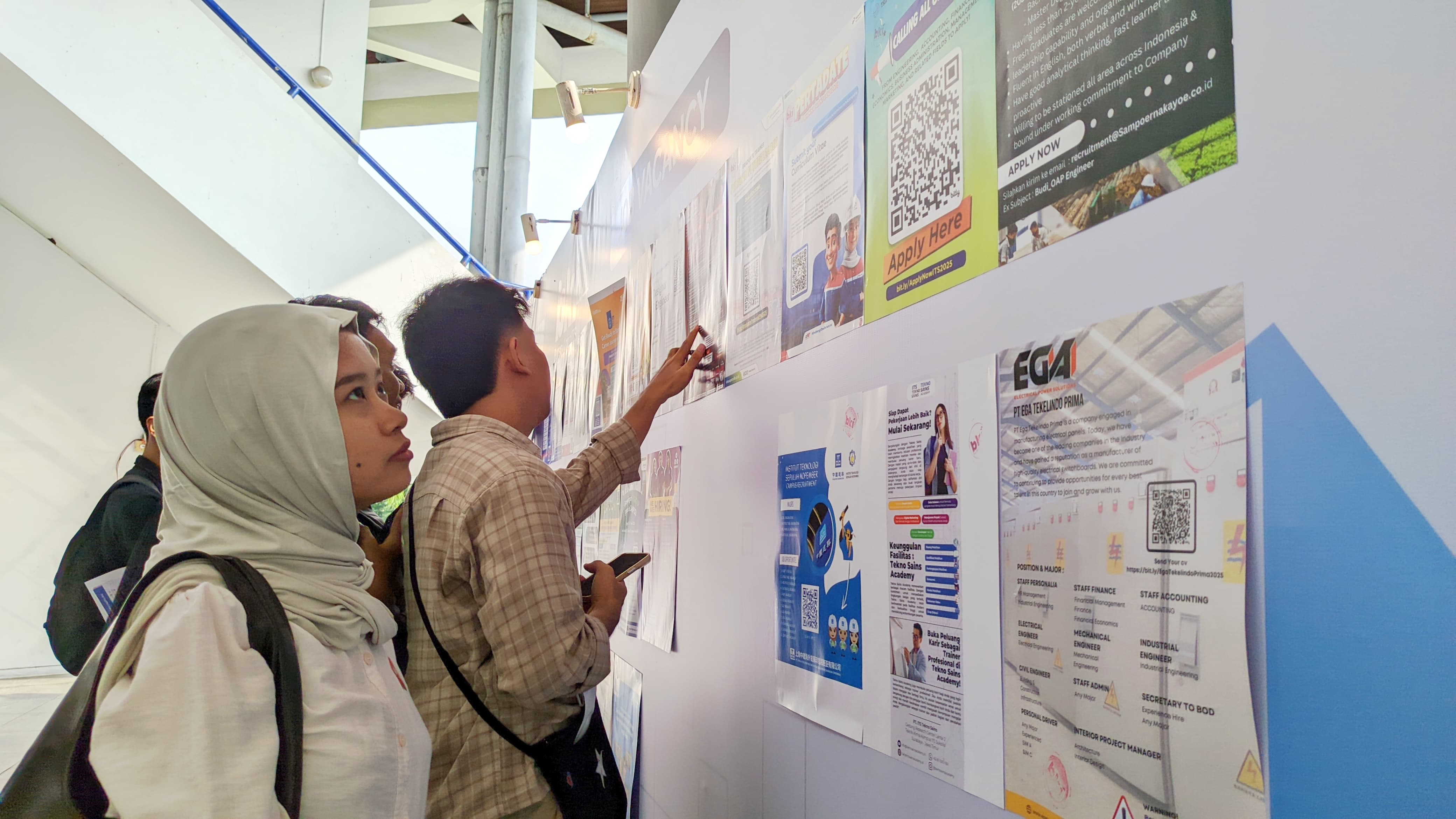 Mahasiswa Departemen Manajemen Bisnis ITS Malva Aliya Izza Bachtiar mengamati jajaran poster lowongan kerja berbagai perusahaan