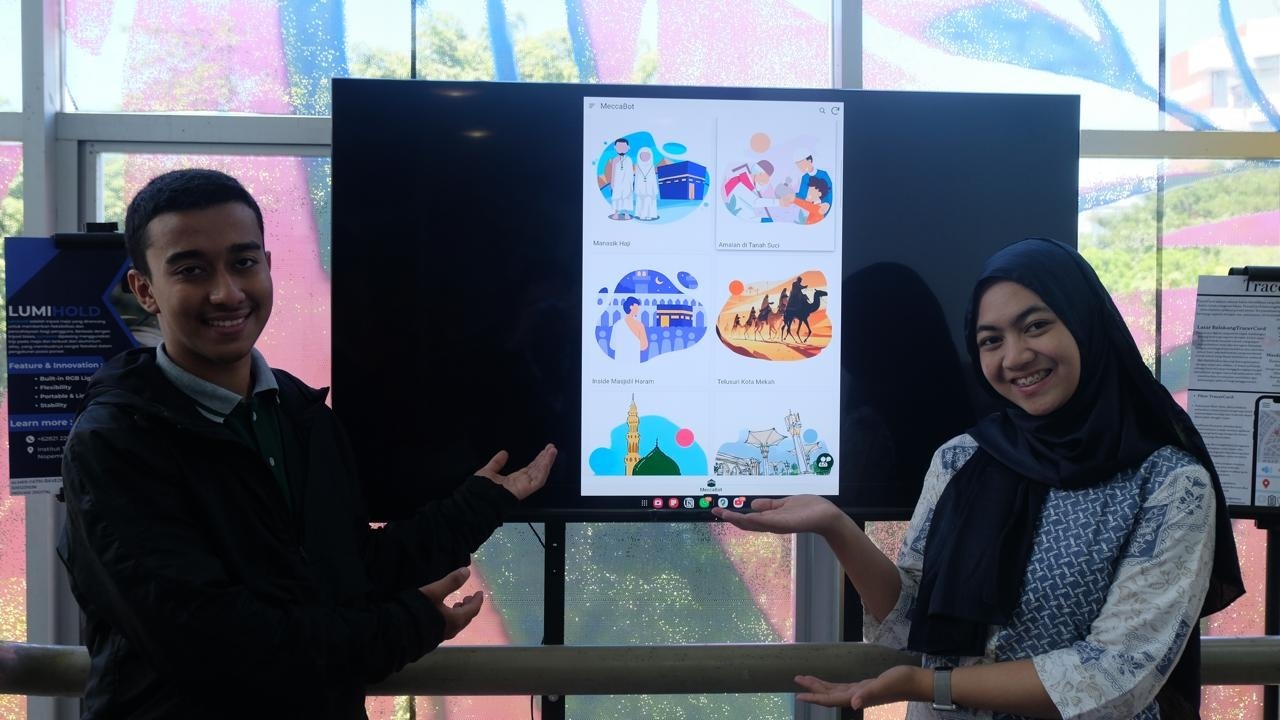 Umar Al-Hadad dan Erika Cahyaningtyas, mahasiswa anggota tim pengembang aplikasi MeccaBot AI menunjukkan beberapa fitur dalam aplikasi rancangan timnya