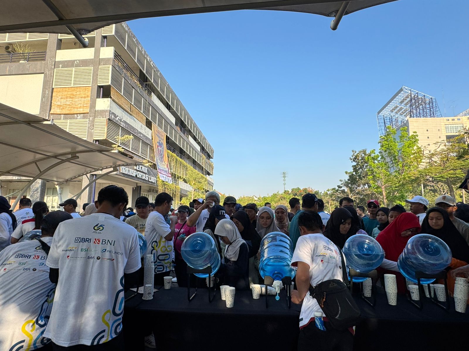 Para peserta jalan sehat Dies Natalis ke-65 ITS sedang mengisi ulang air minum dari galon-galon yang disediakan oleh panitia
