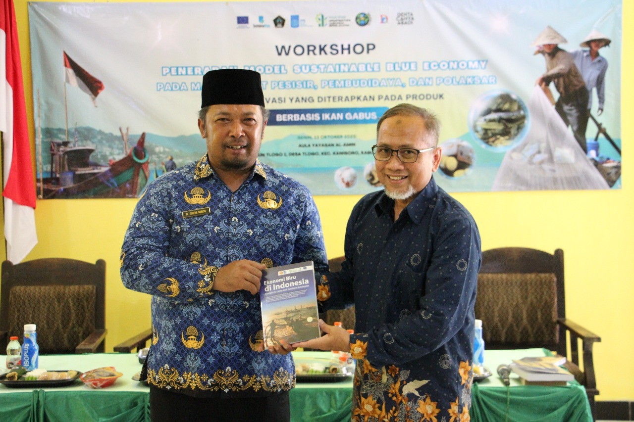Program Manager SBEC ITS Aunurohim SSi DEA (kanan) memberikan buku hasil kerja sama dari para partner SBEC ITS tentang Ekonomi Biru di Indonesia kepada Kepala Dinas Peternakan dan Perikanan Kabupaten Blitar