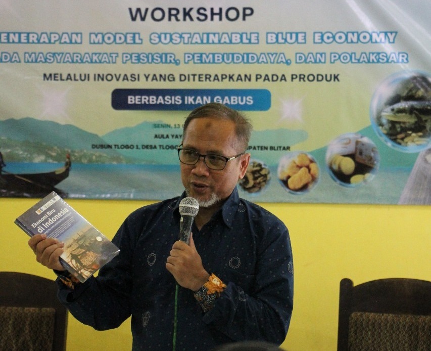 Program Manager SBEC ITS Aunurohim SSi DEA menjelaskan buku hasil kerja sama dari para partner SBEC ITS tentang Ekonomi Biru di Indonesia