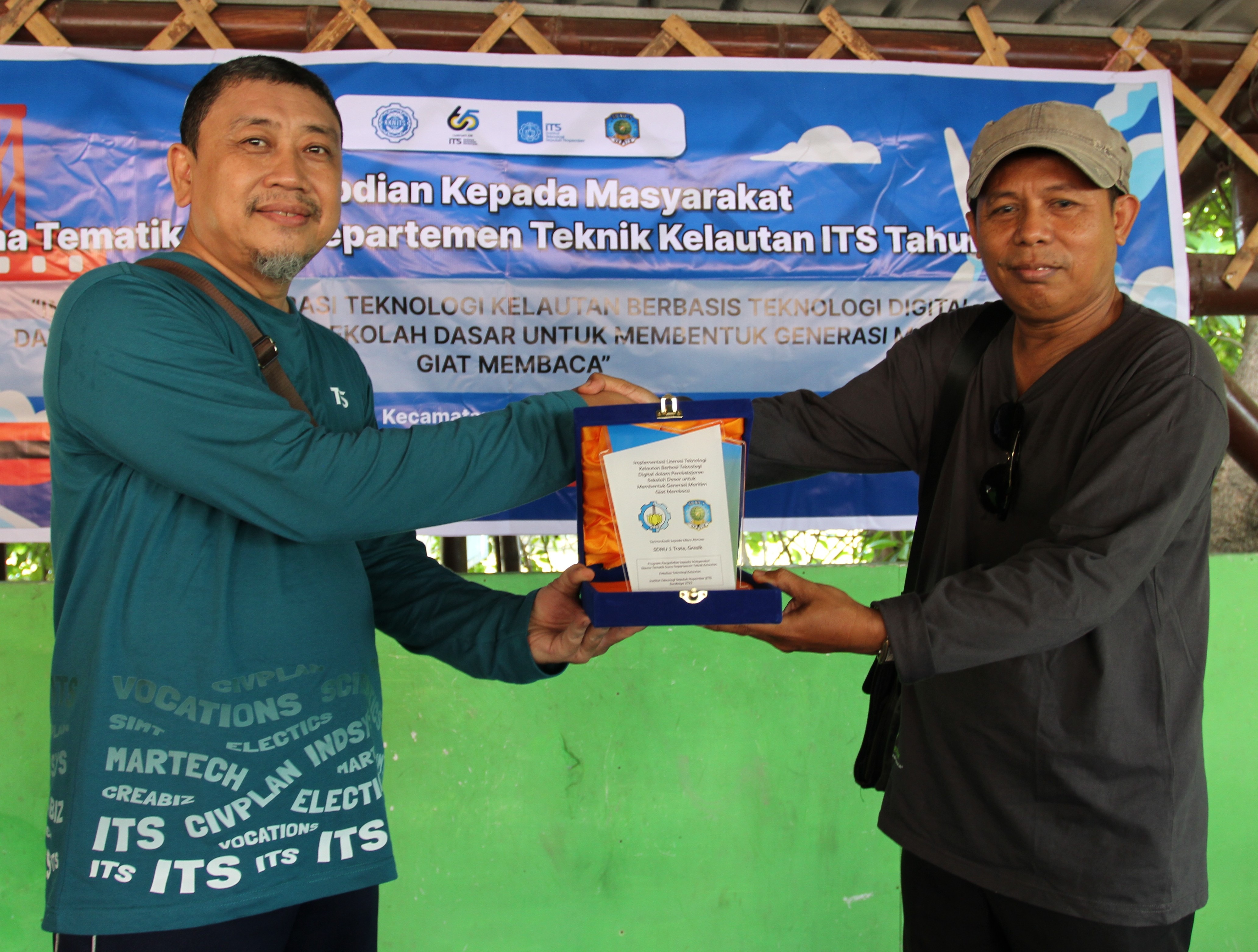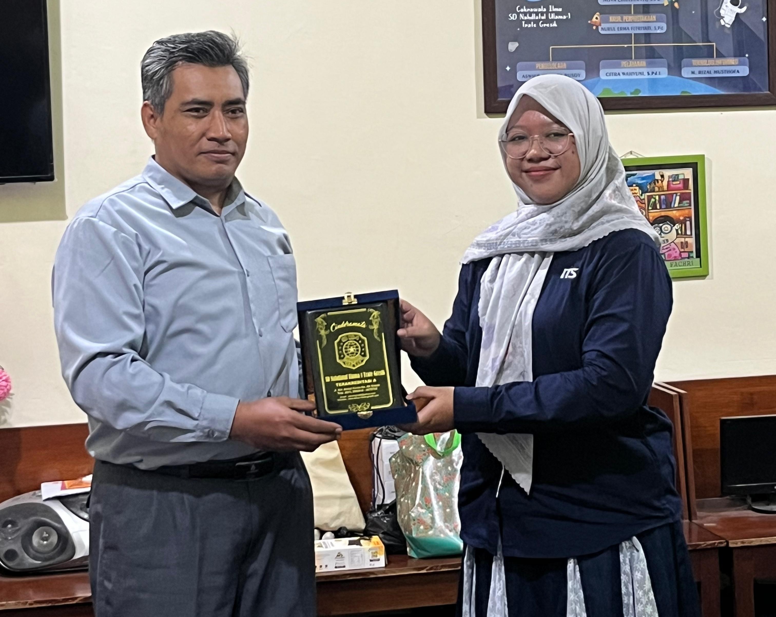 Penyerahan plakat oleh Ferdita Syalsabila ST MT, salah satu dosen anggota Tim Abmas Departemen Teknik Kelautan ITS (kanan) kepada Kepala SD Nahdlatul Ulama 1 Trate, Gresik