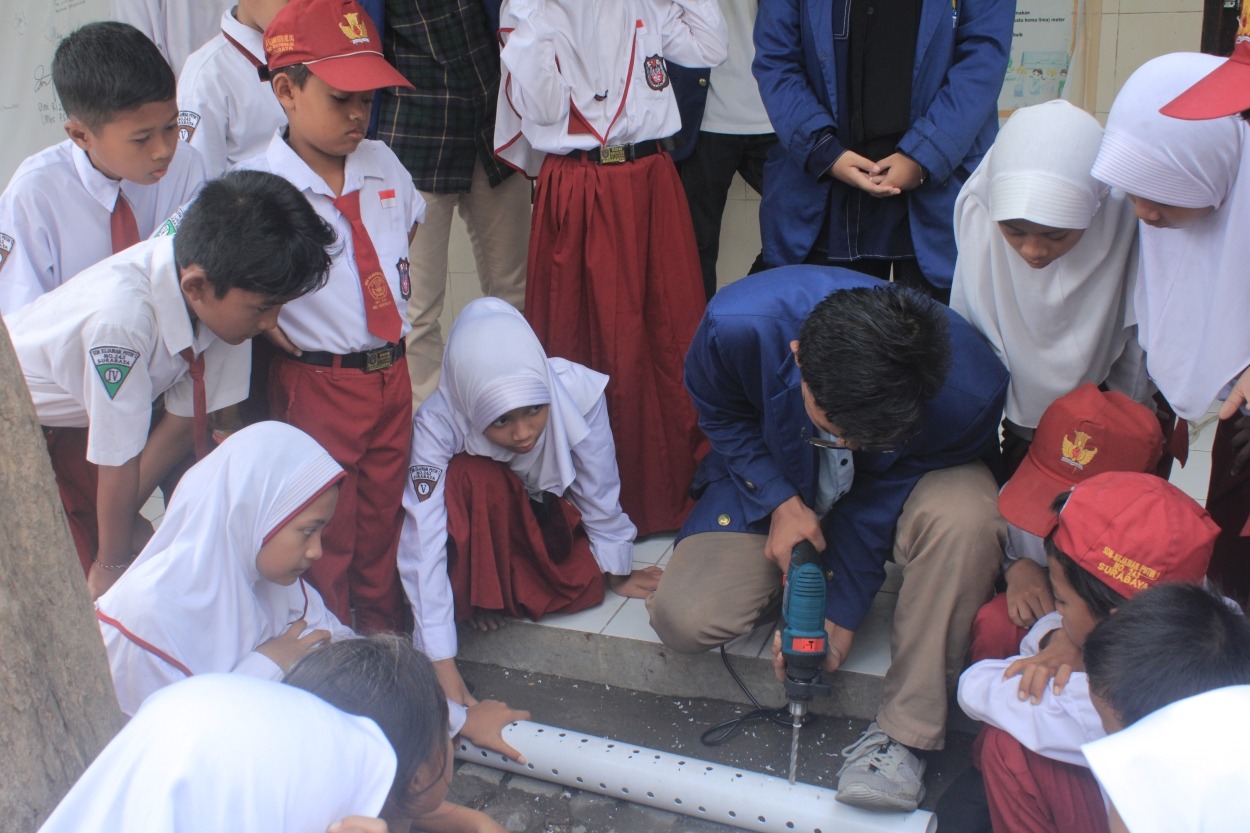 Mahasiswa Teknik Geofisika ITS memberikan contoh pembuatan lubang pada pipa biopori