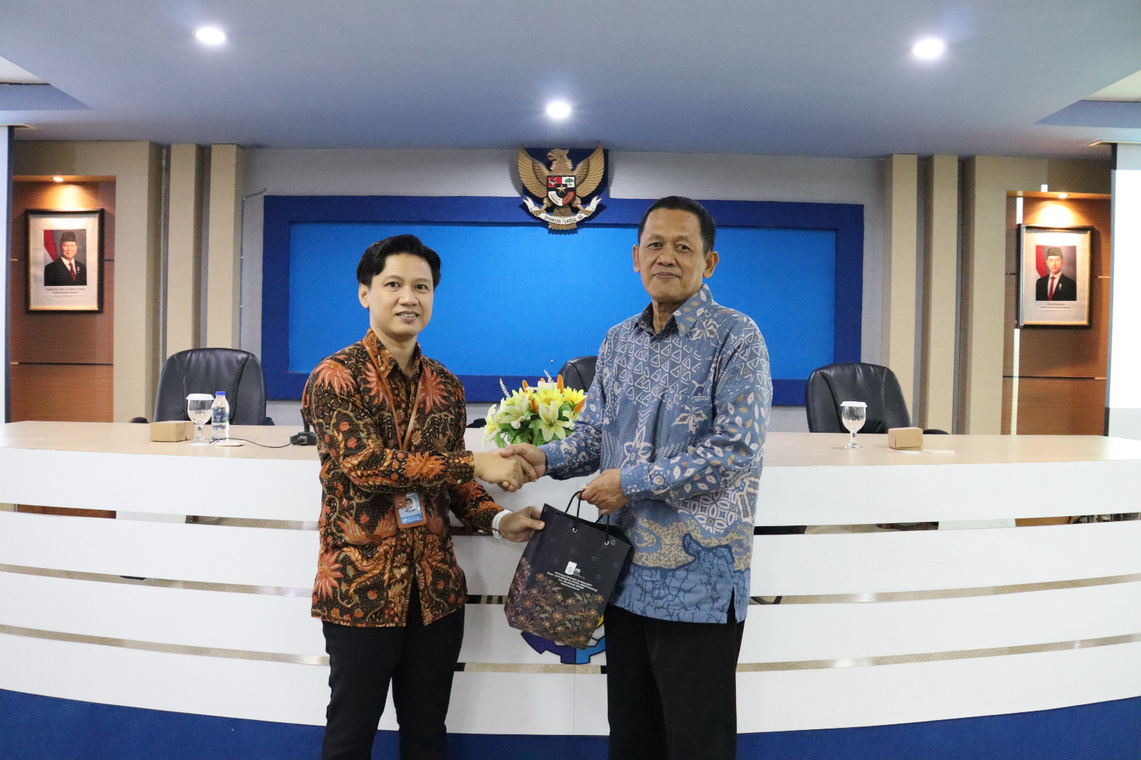 Kepala Perpustakaan ITS Agus Santoso SSos MMedKom (kiri) saling bertukar cinderamata dengan Ketua Tim Kerja Layanan Informasi BSN Minanuddin SIP MHum