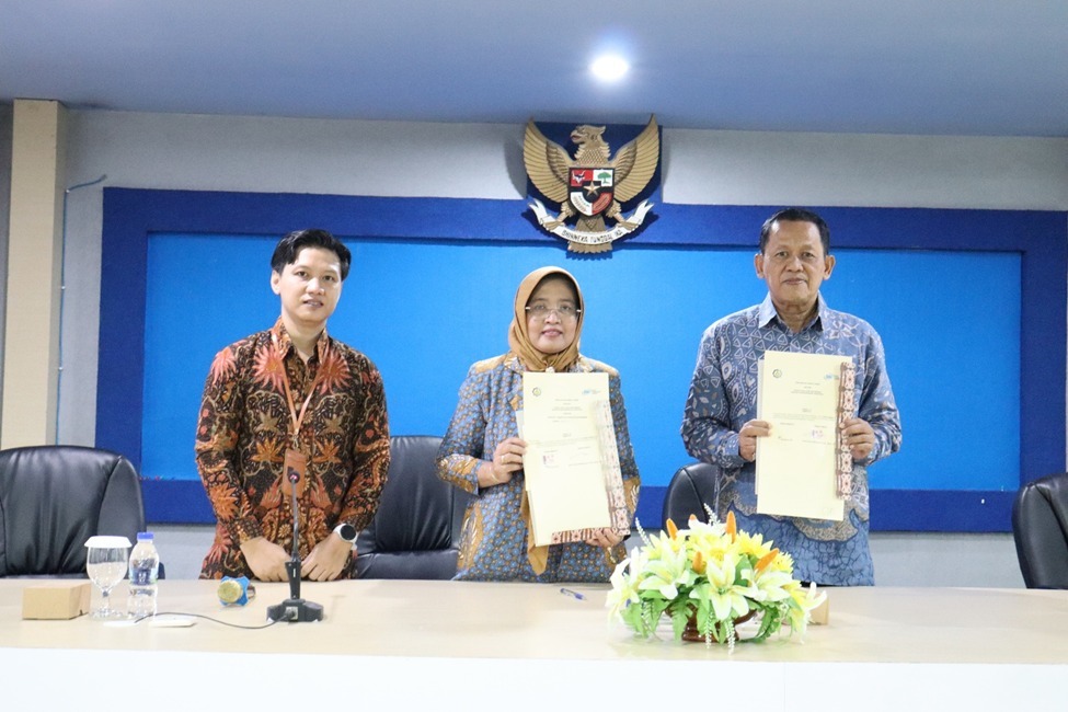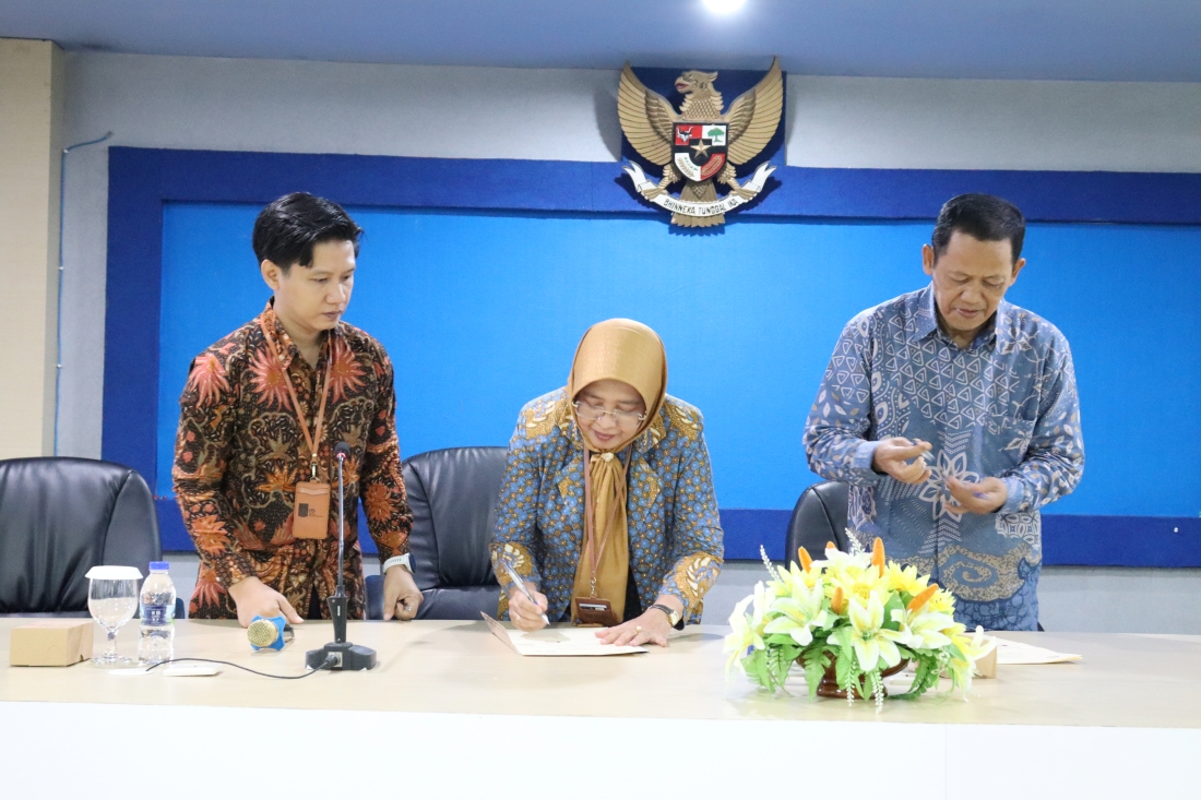 Penandatanganan PKS antara ITS dengan BSN oleh Wakil Rektor I ITS Prof Nurul Widiastuti MSi PhD (tengah) dengan Ketua Tim Kerja Layanan Informasi BSN Minanuddin SIP MHum (kanan)