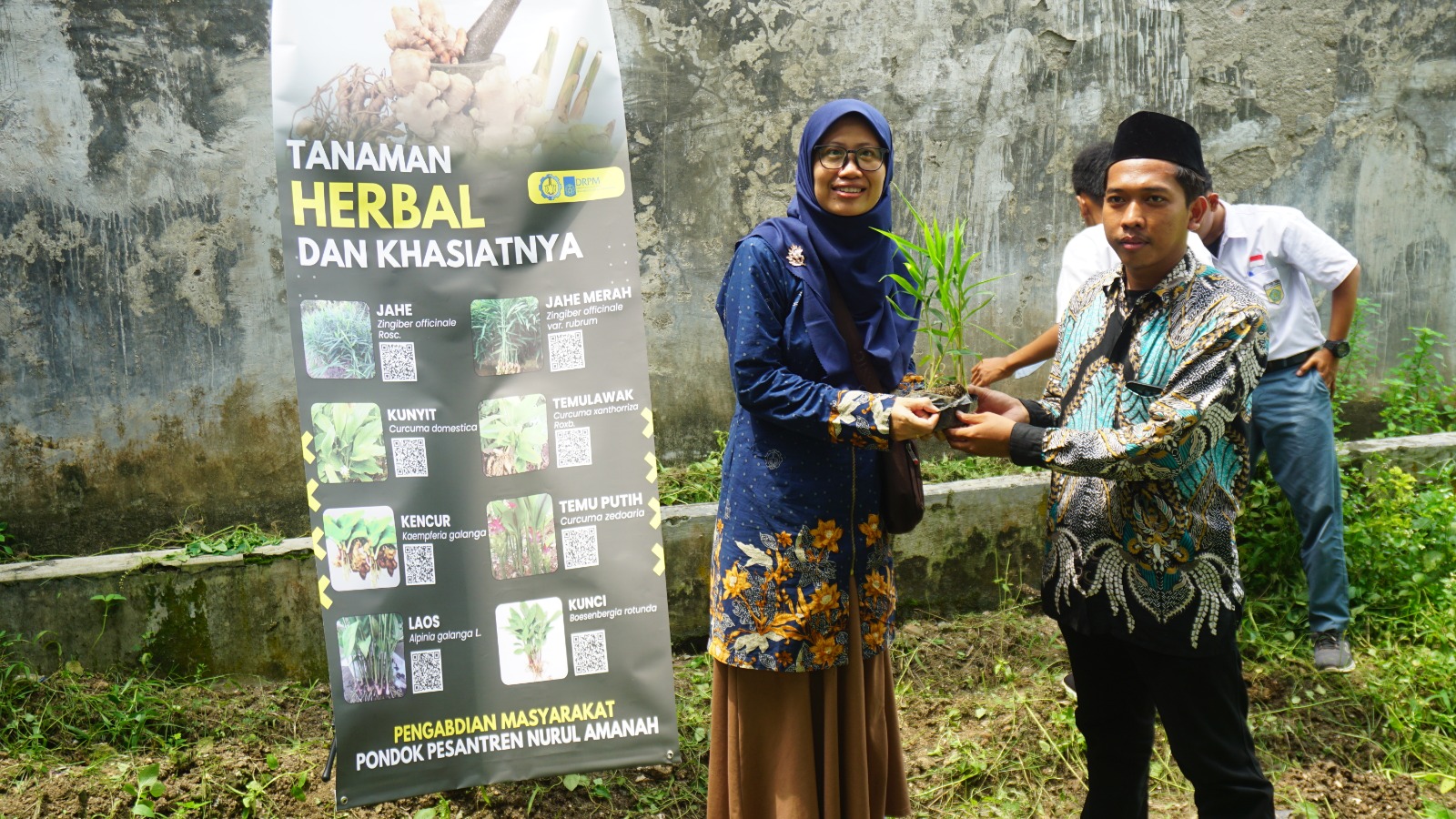 Dr Wirdhatul Muslihatin SSi MSi (kiri) secara simbolis menyerahkan tanaman rimpang kepada ustadz Pondok Pesantren Nurul Amanah Bangkalan Madura