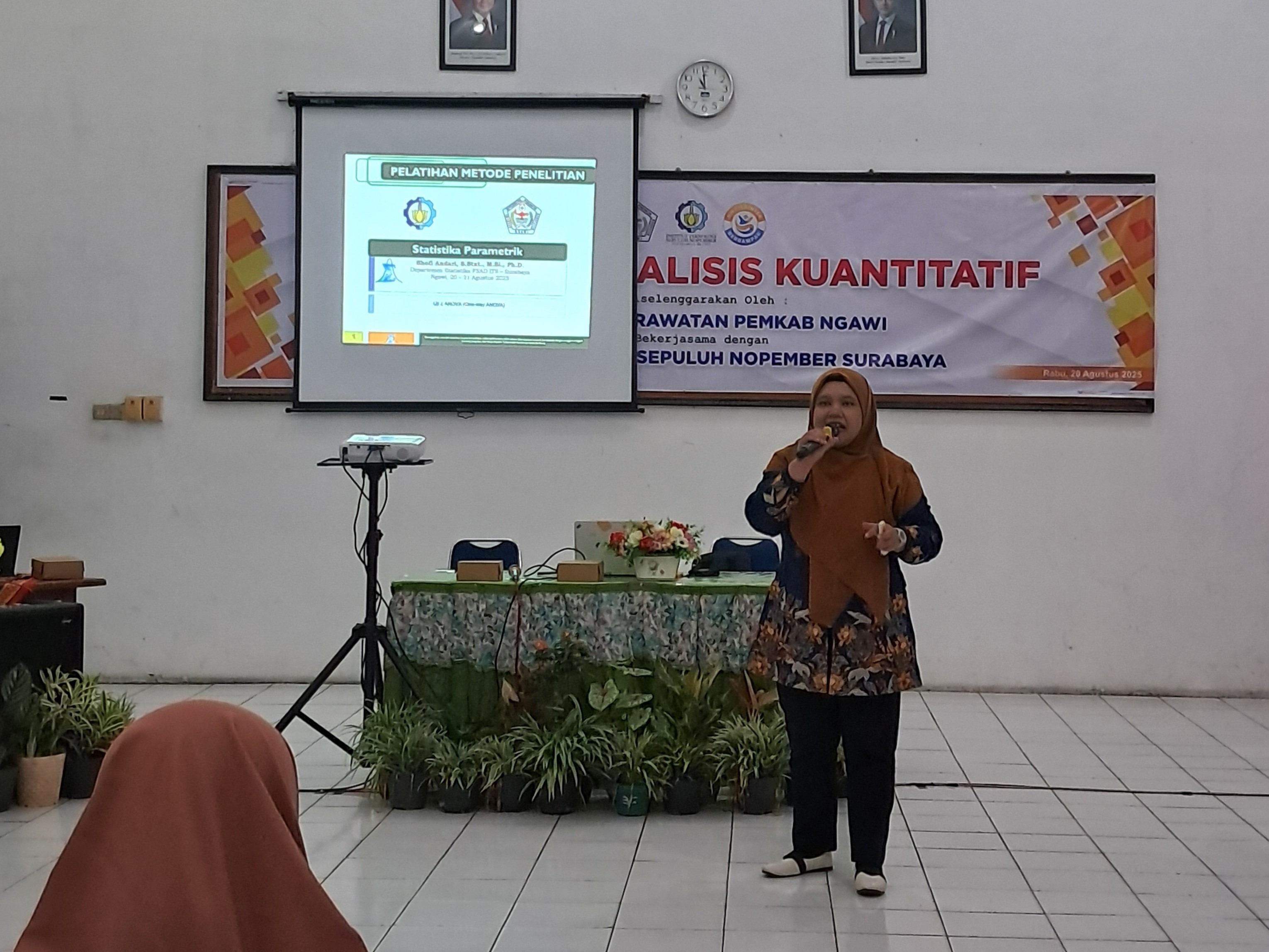 Kampus ITS, ITS News — Institut Teknologi Sepuluh Nopember (ITS) kembali menunjukkan komitmennya dalam mendukung peningkatan kualitas riset di bidang kesehatan. Melalui Tim Pengabdian kepada Masyarakat (Abmas), Departemen Statistika ITS menggelar pelatihan peningkatan kapasitas analisis data statistika bagi dosen Akademi Keperawatan (Akper) Pemerintah Kabupaten (Pemkab) Ngawi, 20 Agustus 2025 lalu.