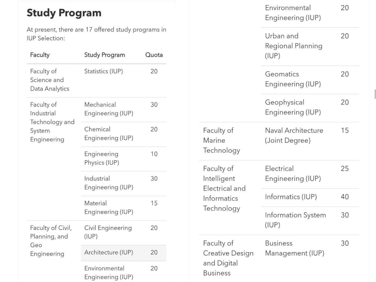 Melalui program IUP ini, kuota penerima untuk seluruh gelombang sebanyak 385 mahasiswa baru yang meliputi 17 program studi. Dengan mendaftar jalur ini, mahasiswa akan mendapatkan keuntungan berupa student exchange, dual-degree programs, international internships, dan summer courses. Bukan hanya itu, jika lulus pada program ini akan mendapatkan dua gelar sarjana sekaligus, baik gelar sarjana dari ITS maupun gelar sarjana dari kampus luar negeri yang dituju.