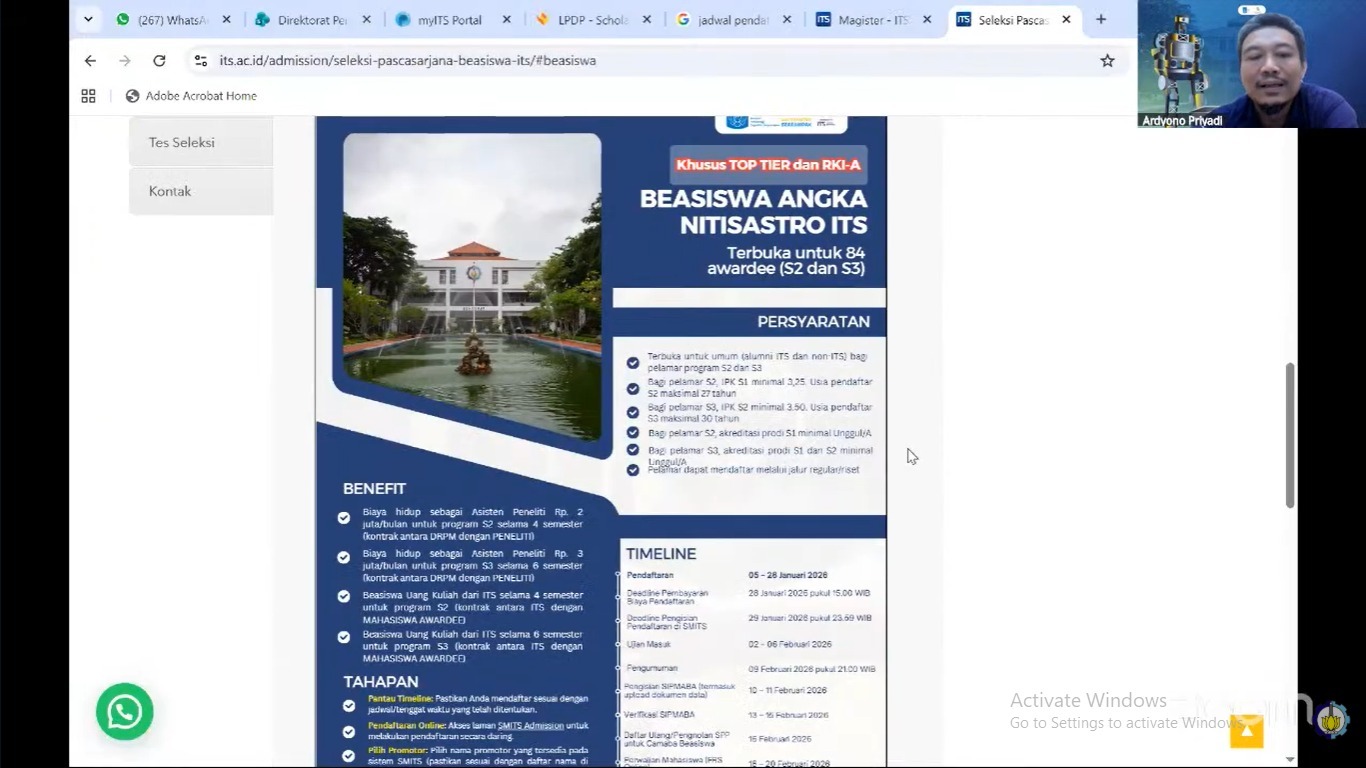 Kepala Subdirektorat Pascasarjana ITS Dr Eng Ardyono Priyadi ST MEng saat menerangkan tentang Beasiswa Angka Nitisastro di ITS pada kegiatan sosialisasi secara daring
