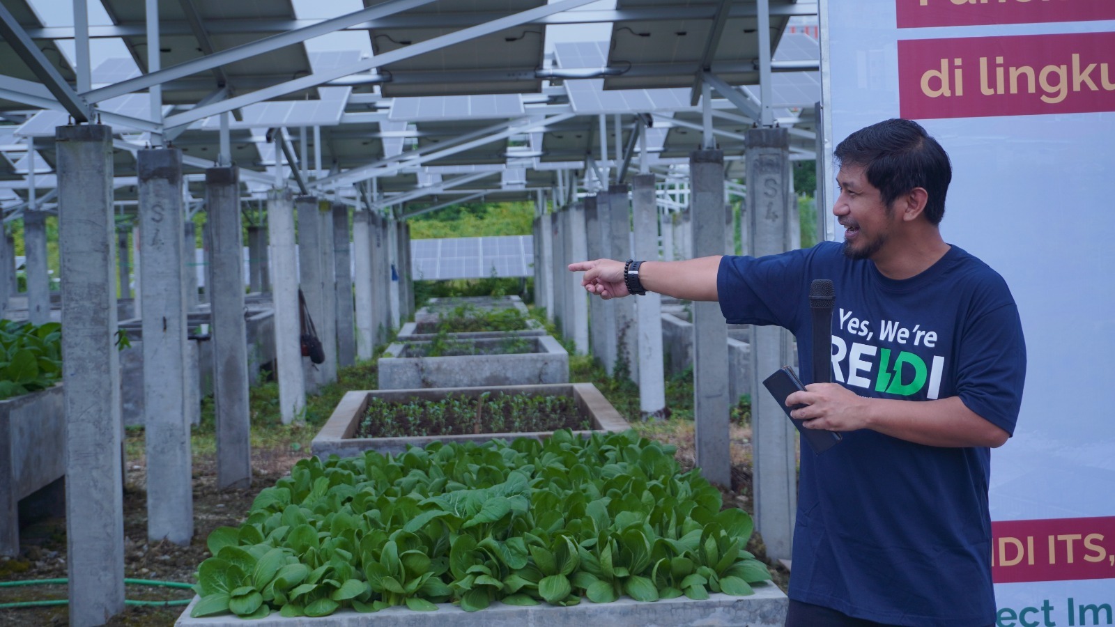 Direktur Riset dan Pengabdian kepada Masyarakat ITS Fadlilatul Taufany ST PhD saat menjelaskan konsep smart agrivoltaic REIDI