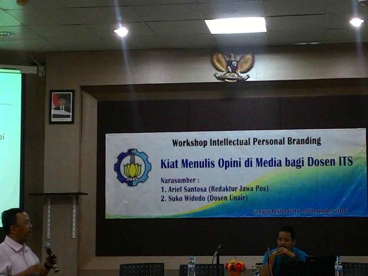 Dalam rangka menyukseskan Program ITS Menulis, Institut Teknologi Sepuluh Nopember (ITS) menggelar Workshop Intellectual Personal Branding, Selasa (6/12). Workshop yang digelar di Gedung Rektorat ITS ini menghadirkan Arief Santosa, Redaktur Jawa Pos dan Drs. Suko Widodo M Si, dosen FISIP Unair sebagai pembicara.