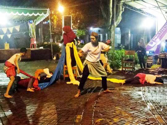 Sesaat, area depan panggung langsung penuh sesak oleh pengunjung Pasar Malam Minggu ITS (Pammits) di Taman Alumni. Pasalnya, mereka dibuat terpukau oleh aksi pementasan teater dari Tiyang Alit. Terlebih