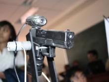 Dor..dor..dor.., terdengar suara letusan peluru dari pistol air soft gun tipe glock 19C. Sebagai sistem pengaman ruangan, karya Candra Uji Wira Prakoso mahasiswa D4 Teknik Informatika PENS ini menggabungkan