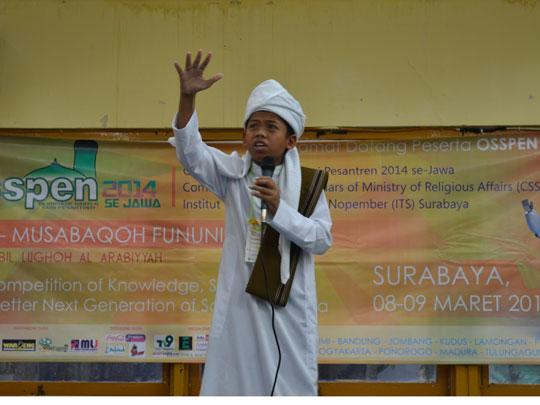 Lantunan kalimat bahasa Arab dan Inggris bergemuruh di Jurusan Kimia ITS. Bocah dengan seragam khas santri berekspresi di atas panggung dengan penuh wibawa. Cabang Kuthbah Billughah Al-arabiyah (Pidato Bahasa