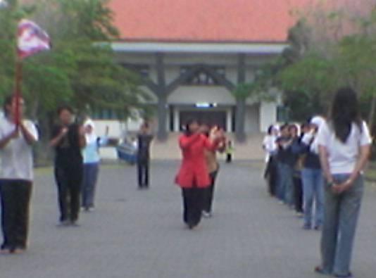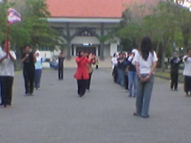 ITS yosh(i)!!!Shitashimi yasui ! Shoujiki !Seijitsu!Chuusei! yuyasa... Sekitar 30 orang meneriakkan yel2 di depan UPT Bahasa pada sore hari Kamis