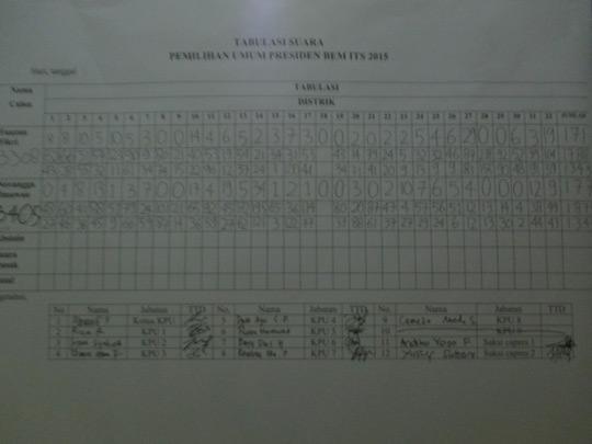 Tabulasi suara untuk Pemilihan ITS Raya (Pemira) telah usai, Sabtu dini hari (17/10). Dari hasil perhitungan tersebut, Novangga Ilmawan, Calon Presiden (Capres) BEM nomor urut dua unggul 97 suara