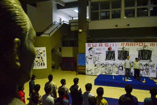 Banyak jalan untuk mengekspresikan kepedulian mahasiswa terhadap kondisi politik di Indonesia. Salah satunya melalui jalur seni. Seperti yang dilaksanakan Komunitas Ruang 109 besutan mahasiswa Jurusan Desain Produk Industri (Despro)