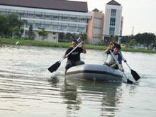 Kolam Fakultas Teknologi Kelautan (FTK) tampak riuh dengan teriakan beberapa mahasiswa, Rabu (20/4). Sebuah boat karet ditumpangi empat orang di dalamnya terlihat melaju berpacu dengan waktu. Itulah keriuhan yang