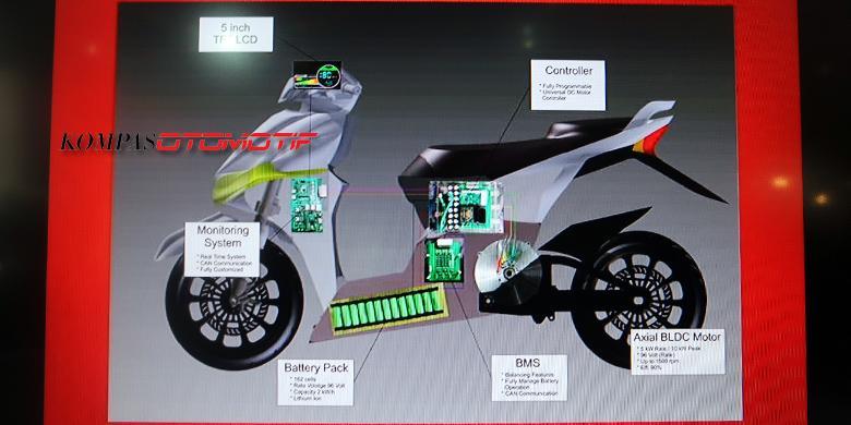 Prototipe motor listrik itu belum berbentuk utuh seperti motor pada umumnya. Rangka, ban dan motor listrik sudah terpasang, tetapi bodi yang menempel di rangka belum dipasangkan.