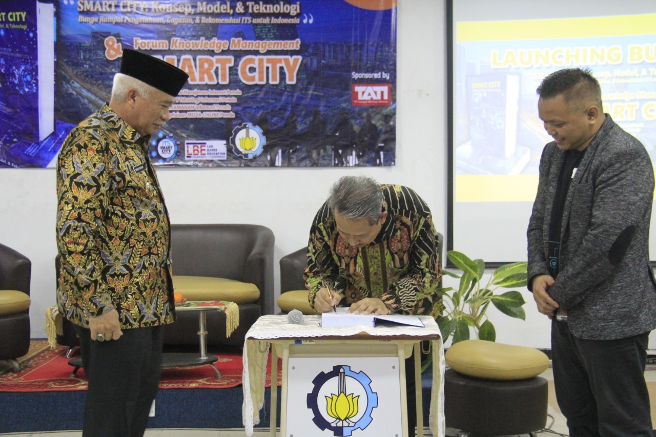 Accompanied by Banggai Laut Mayor Drs H Wenny Bukamo and Smart City Book Coordinator and editor Tony D Susanto, ITS Chancellor Prof. Joni Hermana signed the ITS Smart City Book