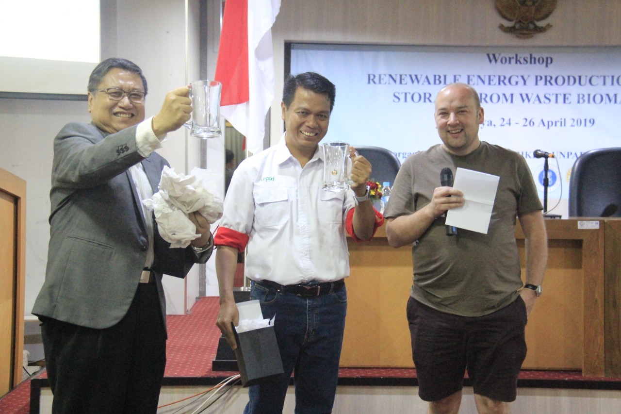 Prof. Darminto from ITS (left) and Prof. Risdiana from Unpad while receiving a souvenir from Prof. Alan Drew (right) from Queen Mary University of London