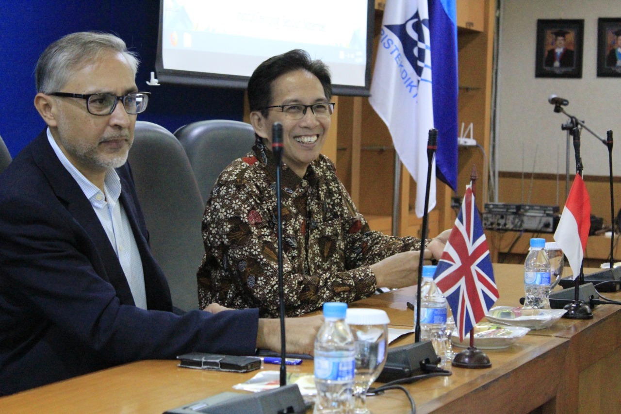 United Kingdom Ambassador Moazzam Malik (left) while leading a discussion with the Chancellor of ITS Prof. Mochamad Ashari