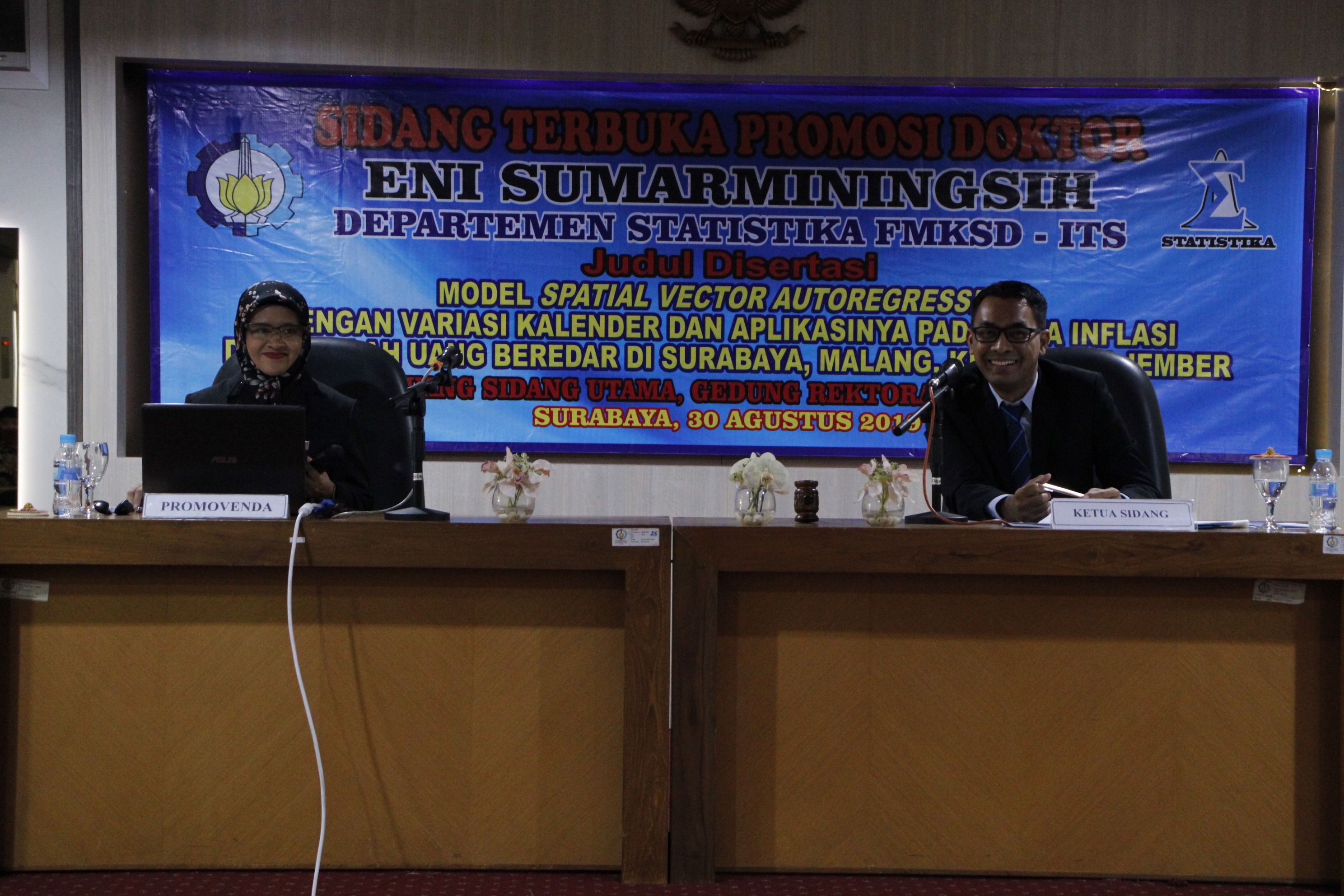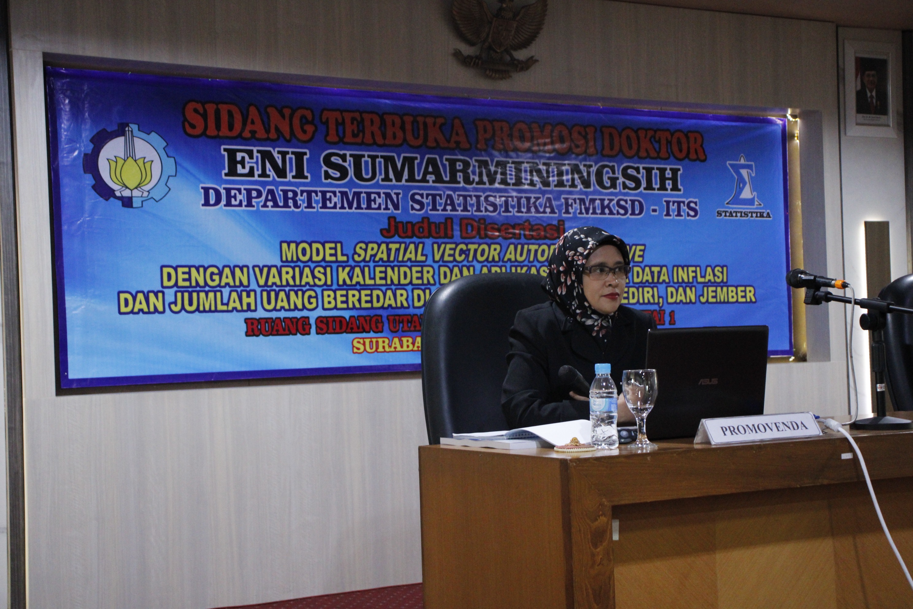 Through her dissertation entitled Spatial Vector Autoregressive Model with Calendar Variation and Its Application on Inflation Data and The Amount of Money Supply in Surabaya, Malang, Kediri, and Jember, Eni managed to earn her doctoral degree in open session of doctoral promotion in the Main Meeting Room of ITS Rectorate Building, Friday (30/8).