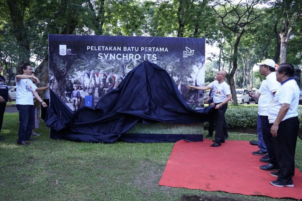 The rector of ITS Prof. Mochamad Ashari (left) with the chairman of IKA ITS PW East Java Dr. Wahid Wahyudi opened the curtain covered picture of Synchro ITS that will be built later