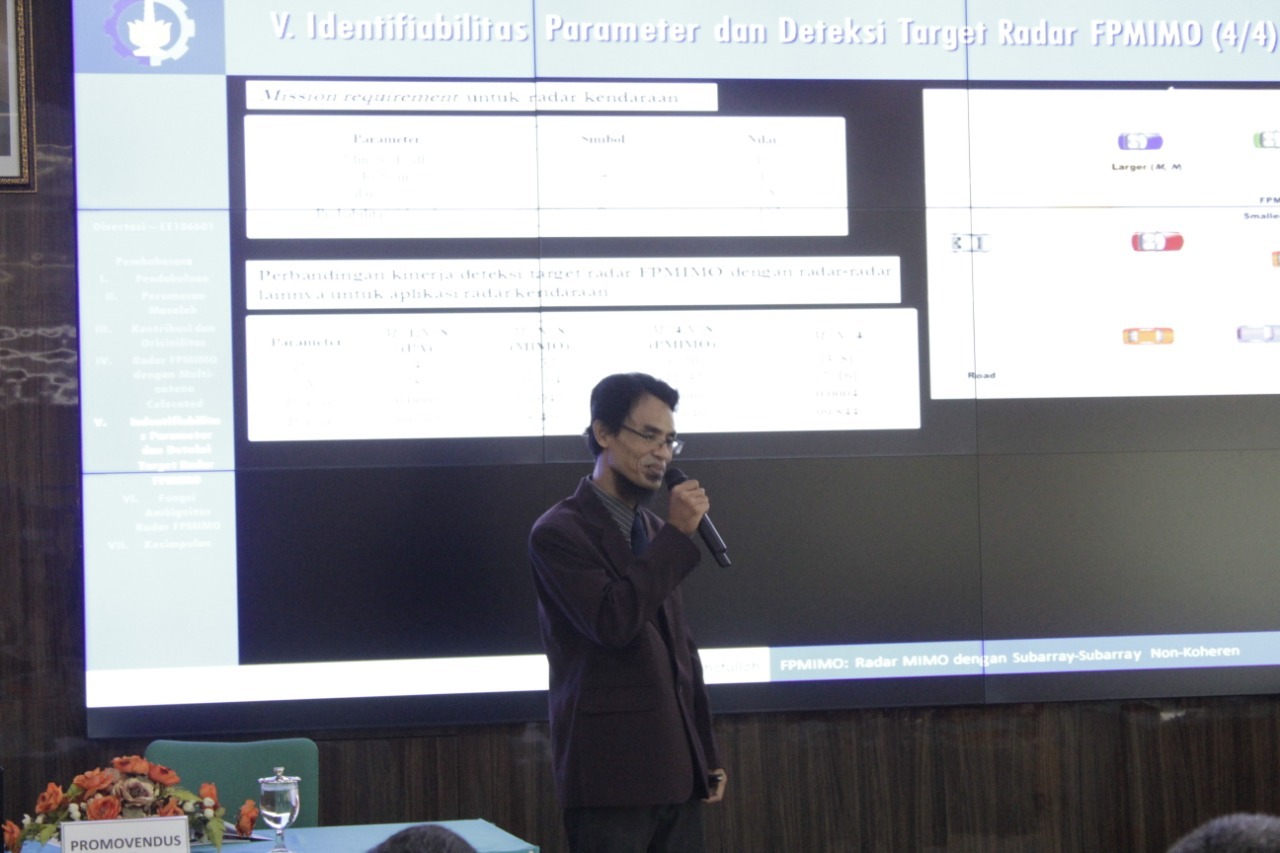 Shahfrizal Tahcfulloh when presenting his dissertation about FPMIMO radar in an doctoral open session promotion in Department of Electrical Engineering ITS