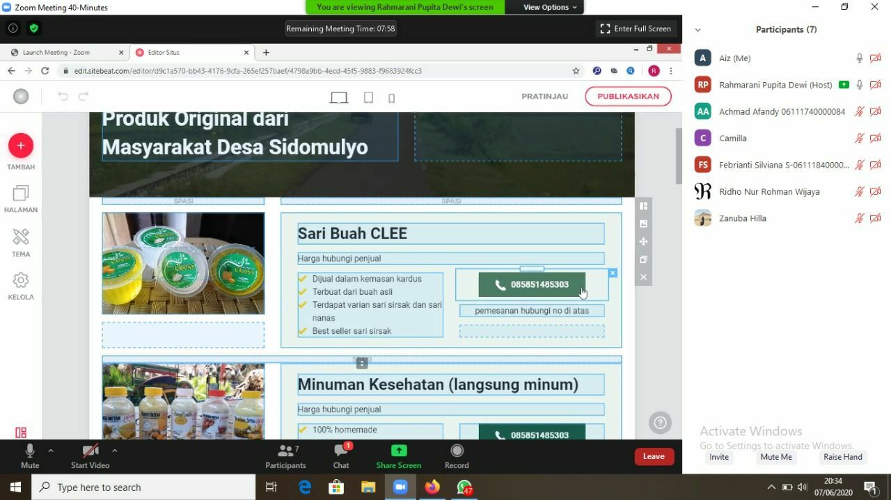 Lebih lanjut, ketua kelas 18, Azizah Wahyantika yang berasal dari Departemen Matematika turut menyebutkan beberapa komoditas unggulan Desa Sidomulyo. Beberapa diantaranya seperti sari buah, gethuk, keripik, dan kue-kue tradisional bisa dilihat langsung melalui tautan sidomulyopuncukediri.sitebeat.site.