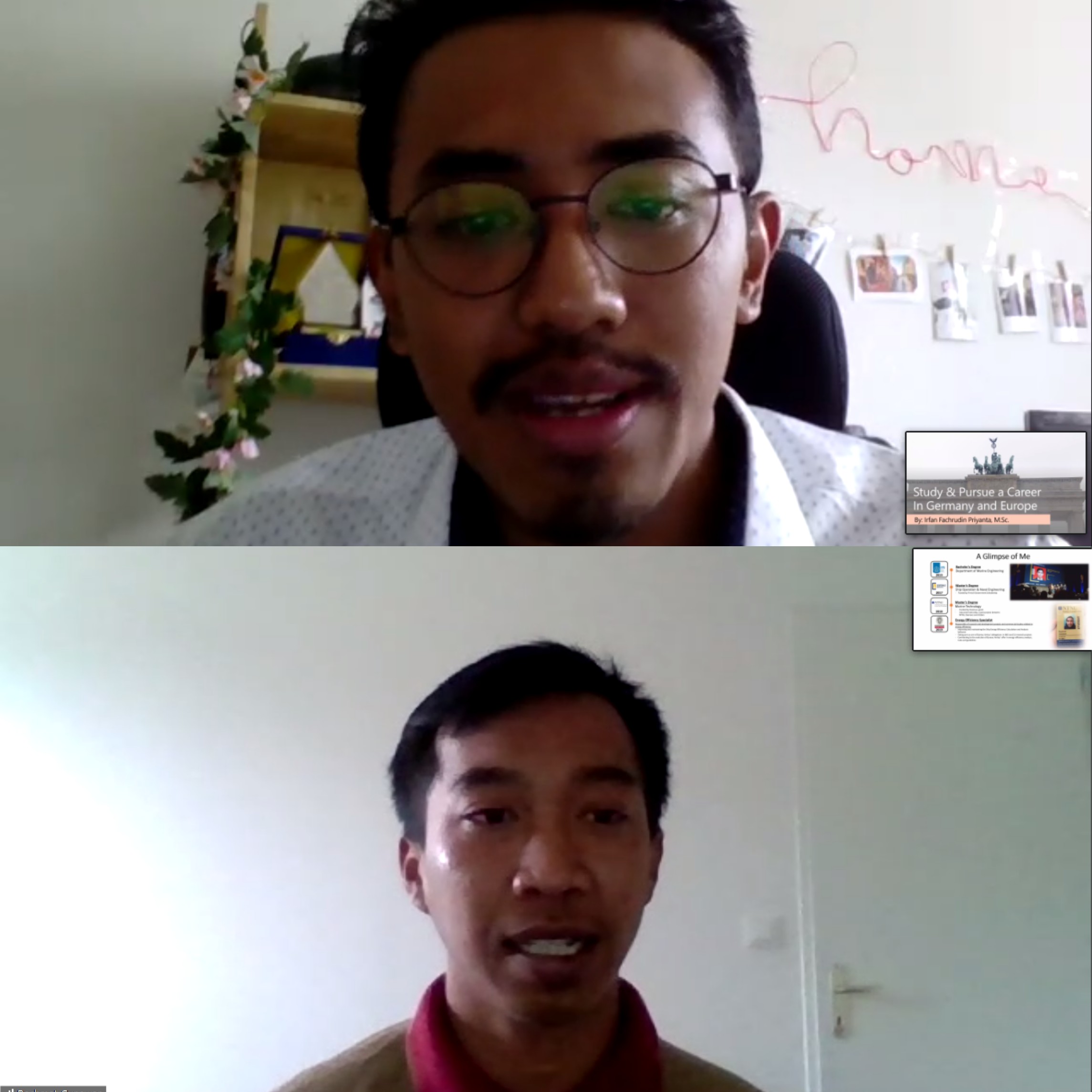 Irfan Fachrudin MSc (on the top frame) and Rachmat Gunawan MSc (on the bottom frame), two alumni speakers of Fast Sharing Session: Study and Careers in Europe