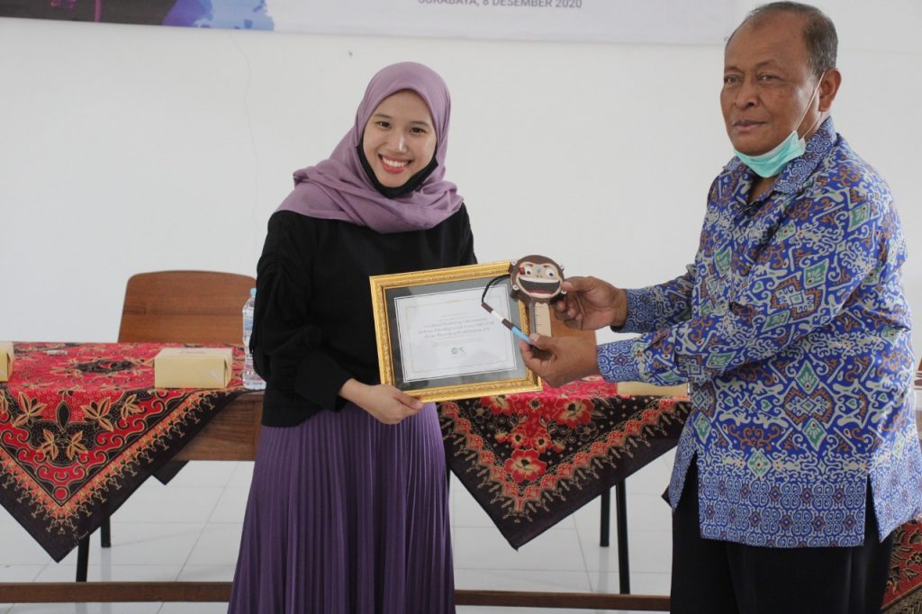 (from left) Azzah Dyah Pramata ST MT MEng PhD when handing over a token of appreciation to the Principal of SMPLB-A YPAB Surabaya, Drs Eko Purwanto