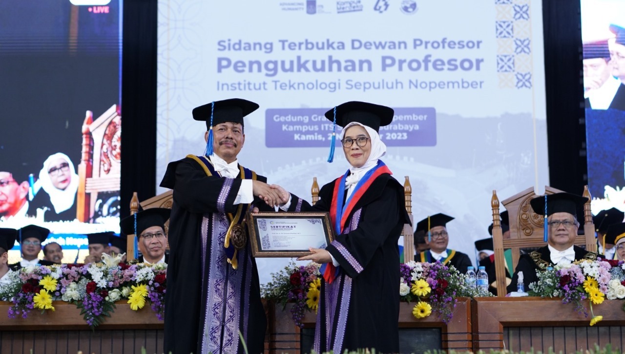 Chair of the ITS Professor Council Prof Dr Ir Imam Robandi MT (left) handed over the inauguration certificate to the 181st ITS Professor Prof Dr Ir Sri Gunani Partiwi MT