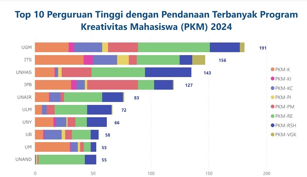 The funded proposals come from eight PKM fields, namely 42 PKM Entrepreneurship proposals (PKM-K), 21 PKM Karsa Cipta (PKM-KC) proposals, 8 PKM Innovative Work proposals (PKM-KI), 10 PKM Applications of Science and Technology (PKM) proposals (PI), 7 Community Service PKM proposals (PKM-PM), 37 Exact Research PKM proposals (PKM-RE), 11 Social Humanities Research PKM proposals (PKM-RSH), and 11 Constructive Ideas Video PKM proposals (PKM-VGK).