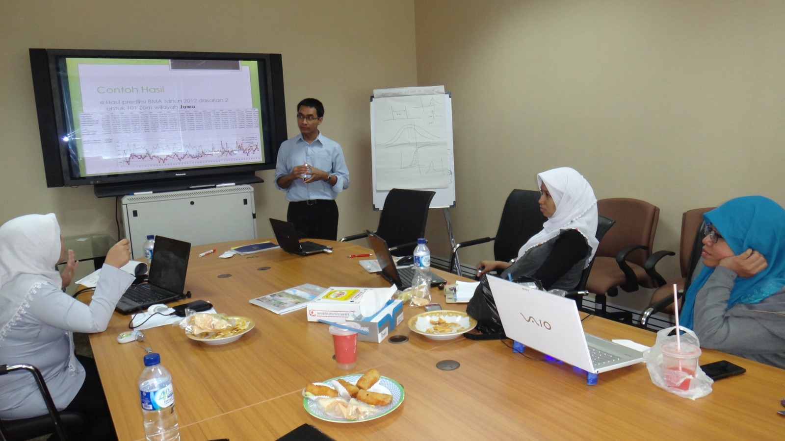 Prof Dr rer pol Heri Kuswanto MSi (standing) with staff from the BMKG Research and Development Center discussing research on weather ensemble forecasts