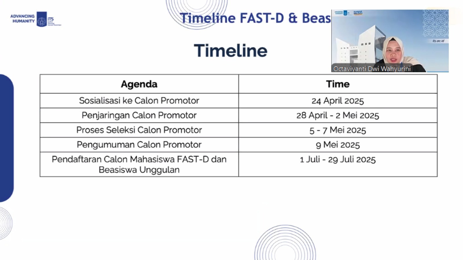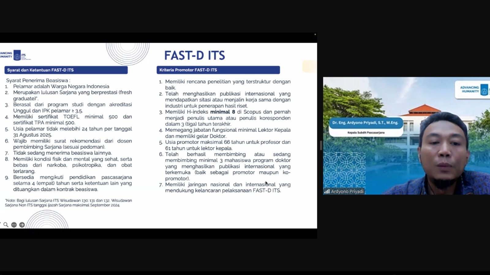 ITS Campus, ITS News – Institut Teknologi Sepuluh Nopember (ITS) always shows its commitment in supporting students to develop their best potential. One of them is shown by socializing the FAST-D Scholarship, Unggulan Scholarship, and Global Excellence Scholarship online, Thursday (24/4) afternoon, which was also attended by lecturers who have the potential to become promoters of postgraduate students.