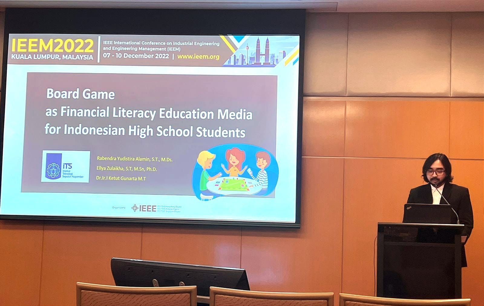 Dr Rabendra Yudistira Alamin ST MDs while presenting the board game innovation at the Institute of Electrical and Electronics Engineers (IEEE) International Conference on Industrial Engineering and Engineering Management (IEEM) 2022.