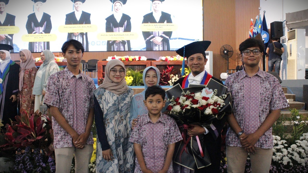 Prof Sigit Tri Wicaksono SSi MSi PhD (second from right) with his family after the ITS Professor Inauguration Ceremony at Graha Sepuluh Nopember ITS