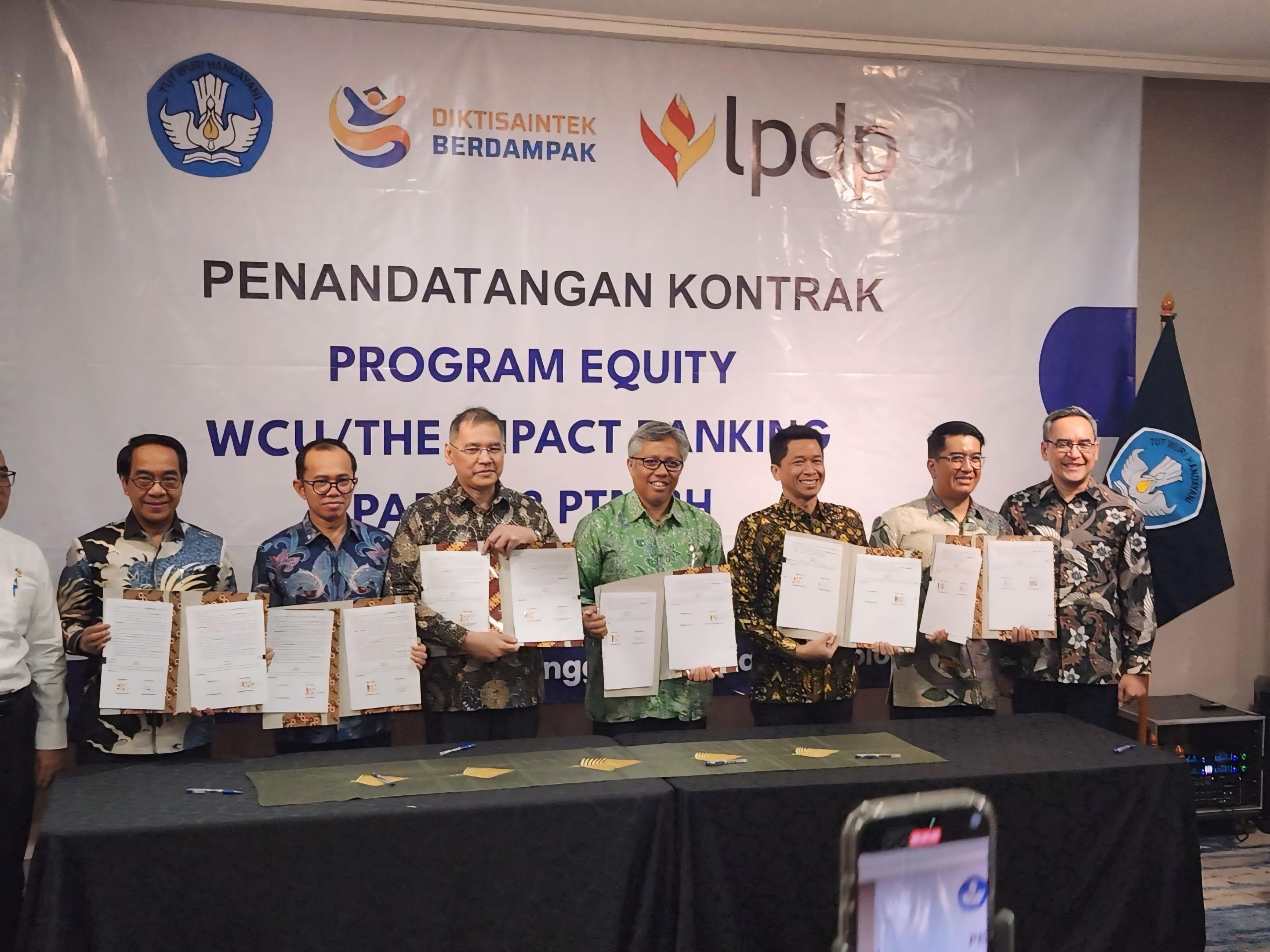 ITS Campus, ITS News — Institut Teknologi Sepuluh Nopember (ITS) signed an Equity World Class University (WCU)/The Impact Ranking Program Contract with 23 State Universities with Legal Entity Status (PTN-BH) at Artotel, Jakarta, on Tuesday (26/8). This event, organized by the Indonesian Ministry of Higher Education, Science, and Technology (Kemdiktisaintek), is a strategic step in strengthening the international recognition of Indonesian universities.