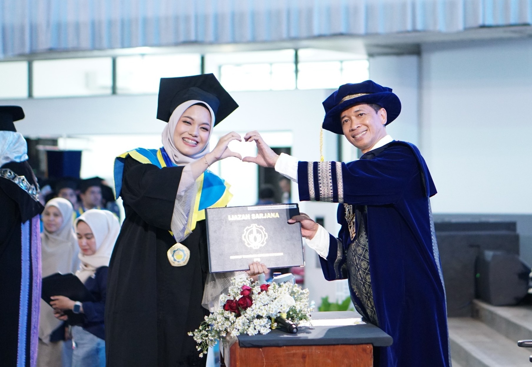 Fathia Rahmanisa Dzakiyyarani, a graduate of the ITS Information Systems Department (left) when receiving her diploma from ITS Chancellor Prof. Dr. (HC) Ir. Bambang Pramujati ST MScEng PhD
