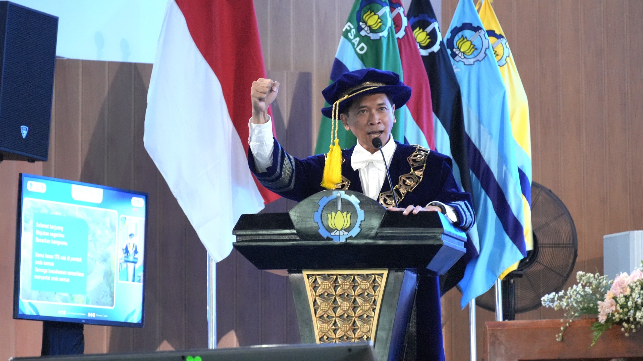 ITS Chancellor Prof. Dr. (HC) Ir. Bambang Pramujati ST MScEng PhD encouraged the graduates after giving a speech at the 132nd ITS Graduation Ceremony on the first day at Grha Sepuluh Nopember ITS