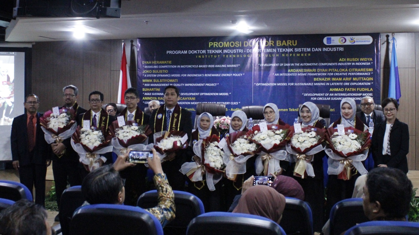 Dr. Dyah Herawatie MSi (sixth from right) with eight other doctors after the Open Doctoral Promotion Session at the Department of Systems and Industrial Engineering, ITS