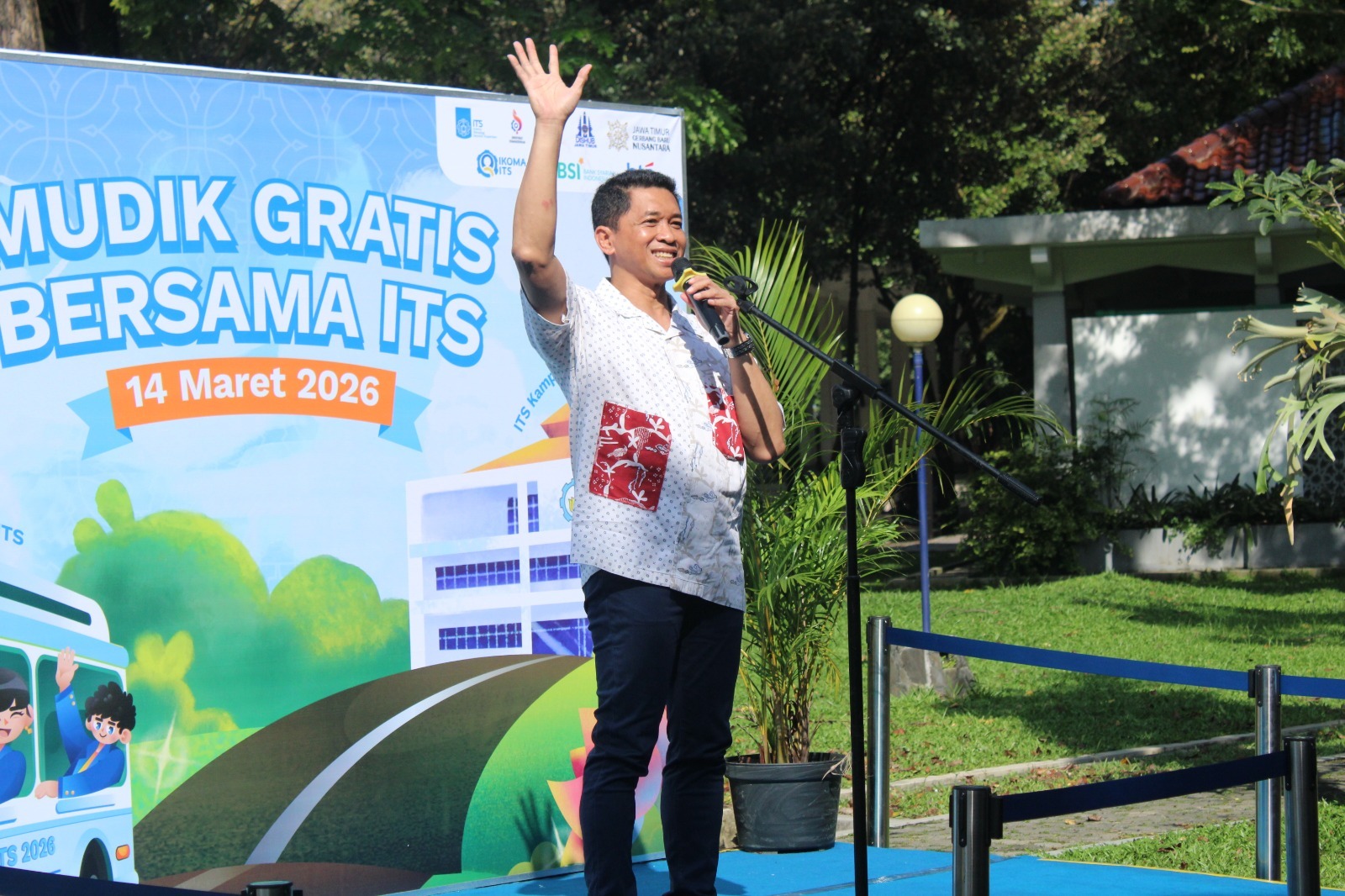 ITS Chancellor Prof Dr (HC) Ir Bambang Pramujati ST MScEng PhD (holding the flag) while preparing to release the departure of the Free Homecoming with ITSFurthermore, the man familiarly known as Rofiq stated that the free homecoming program at ITS is divided into 19 routes, deploying 27 buses. More specifically, there are nine routes in East Java, including the routes of Pasuruan – Probolinggo – Lumajang – Jember, Lamongan – Bojonegoro – Tuban, Bondowoso – Situbondo – Banyuwangi, Malang – Batu, Madiun – Magetan, Ponorogo – Pacitan, Kediri – Pare – Trenggalek, Tulungagung – Blitar, and Mojokerto – Jombang – Nganjuk – Ngawi.