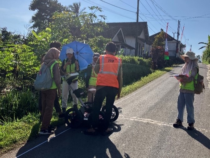 Para mahasiswa Teknik Geofisika ITS menggunakan instrumen georadar untuk mengetahui kondisi kerentanan tanah dan jalan