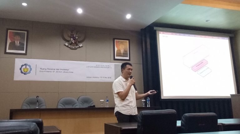Departemen Arsitektur ITS, ITS News – Desain tak hanya bermodal intuisi.Begitulah ucap Erick Kristanto ST M Arch, seorang principal biro arsitek Studio Kota memulai kuliah tamu yang diadakan Departemen