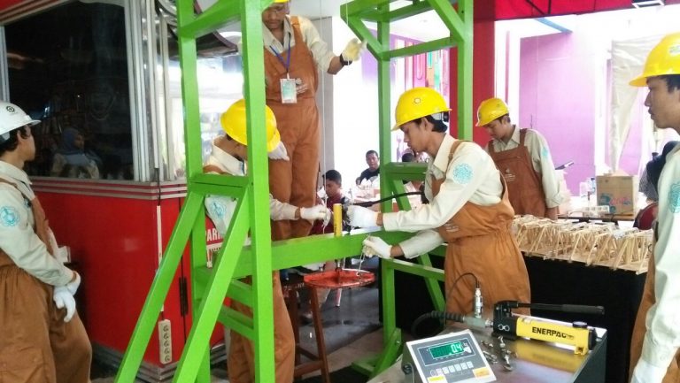 Kampus ITS, ITS News – Kekuatan jembatan dalam menahan beban tarik menjadi salah satu penilaian dalam pengujian lomba konstruksi jembatan Brigde Construction Competition (BCC), yang diikuti pelajar SMA/SMK se-Indonesia.