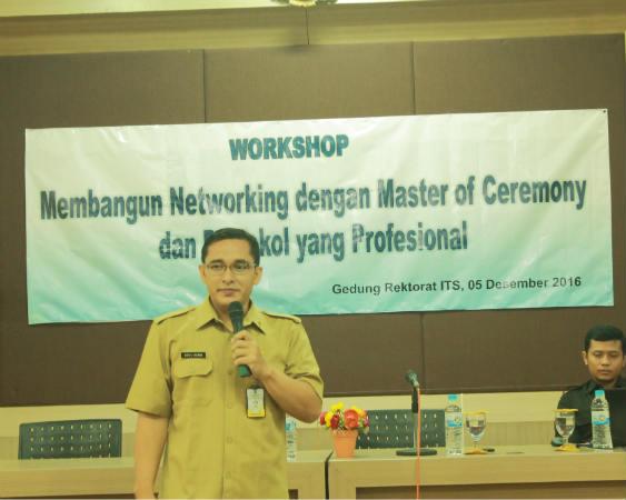 Kepala Sub Protokol Pemerintah Kota Surabaya, Muhammad Wahyu S Sos Msi turut didapuk menjadi salah satu pembicara handal pada Workshop Protokol dan Master of Ceremony (MC) di Gedung Rektorat